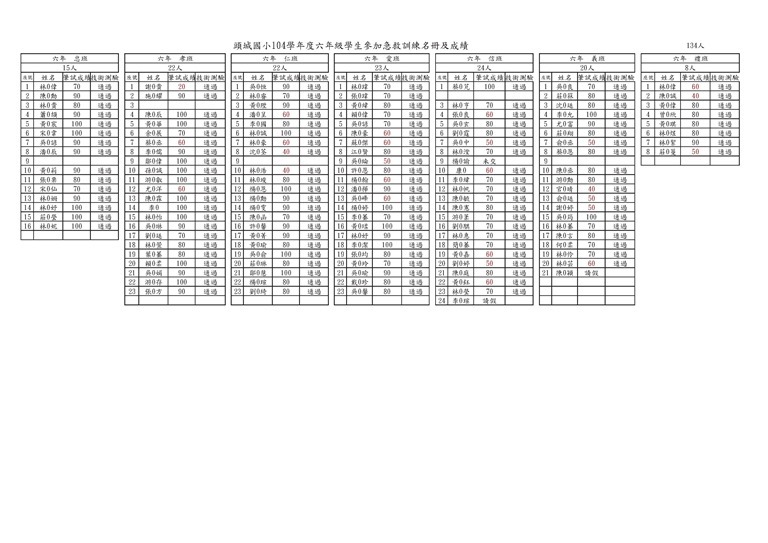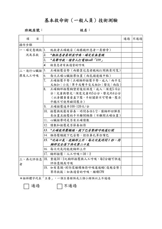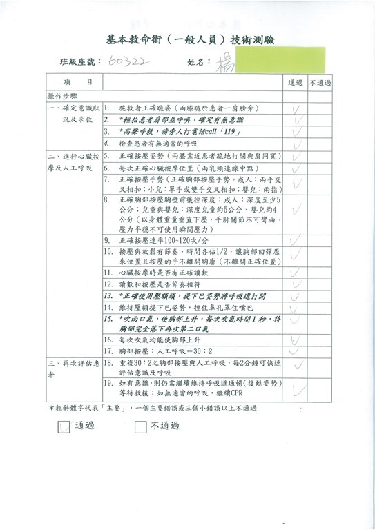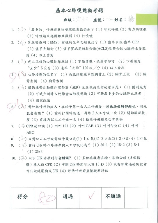104學年度六年級急救訓練66 月 201618 3 月 2021104學年度六年級急救教育(訓練)計畫104學年度五、六年級心肺復甦術上課過程急救教育認知測驗分組練習急救技術測驗訓練結果1. 參加學童有足夠指導員及時間練習心肺復甦術,當天全數學生有足夠時間能練習操作及通過心肺復甦術技術演練。2. 18.9%學童心肺復甦術知識認知滿分,80.3%學童心肺復甦術知識認知能達到70分以上。3.課前講師播放路人執行CPR影片並詢問學童敢不敢救人,舉手學生寥寥無幾,課後超過2/3數學生舉手表示遇到實際狀況時敢嘗試執行心肺復甦術。