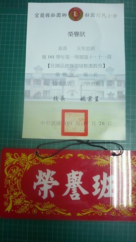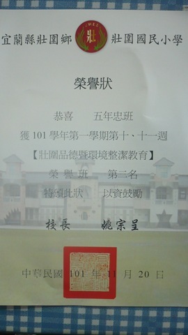 五年忠班榮獲壯圍國小十及十一週品德及環境整潔榮譽班級^_^作者:71142012 年 11 月 21 日2021 年 3 月 18 日 繼二三四五六七週本班榮獲壯圍國小品德及環境整潔榮譽班級後,五年忠班又榮獲壯圍國小十及十一週品德及環境整潔榮譽班級^_^
