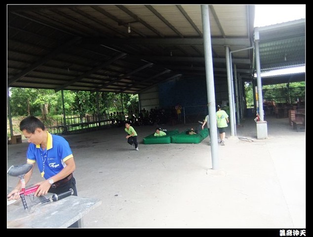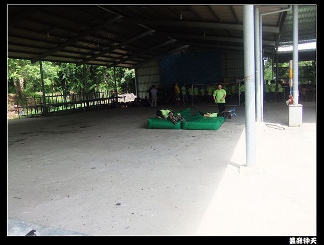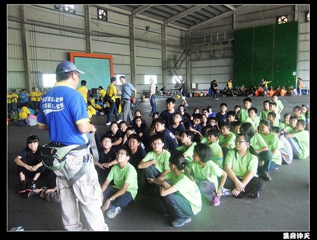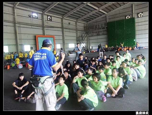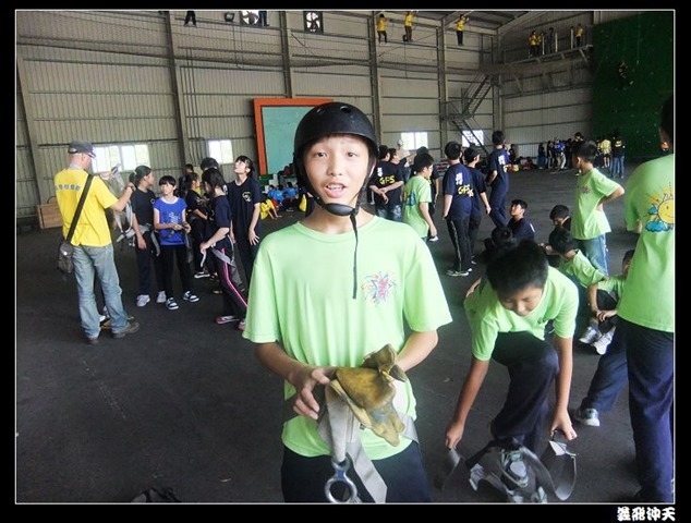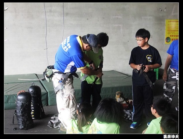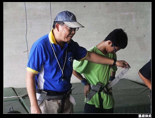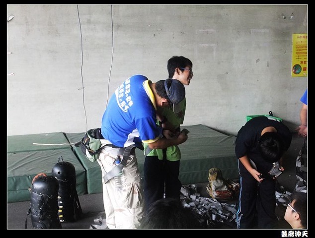 第一站來到高空垂降,教官先徵召各班勇將一名出來示範裝備的穿脫,本班當然派出體能、頭腦都一級棒的班長出來應戰。