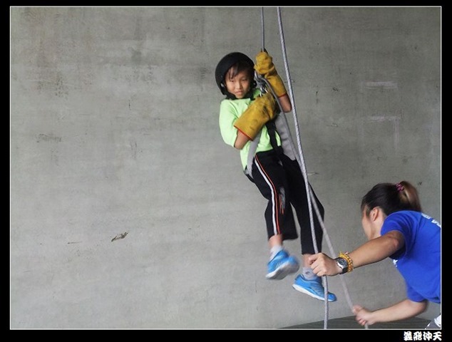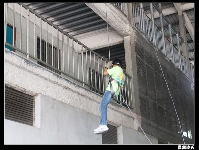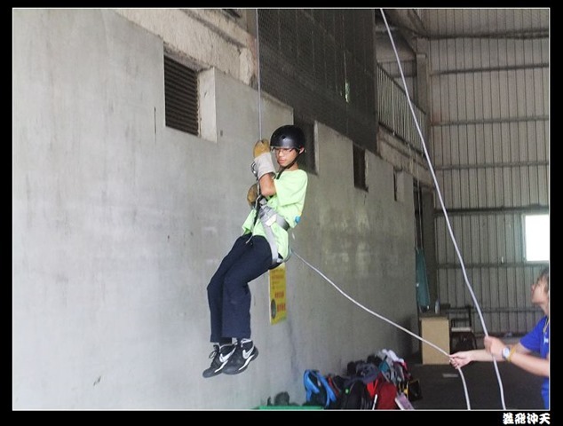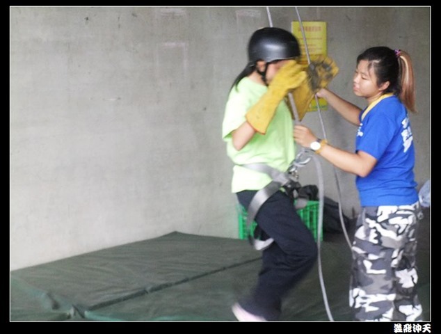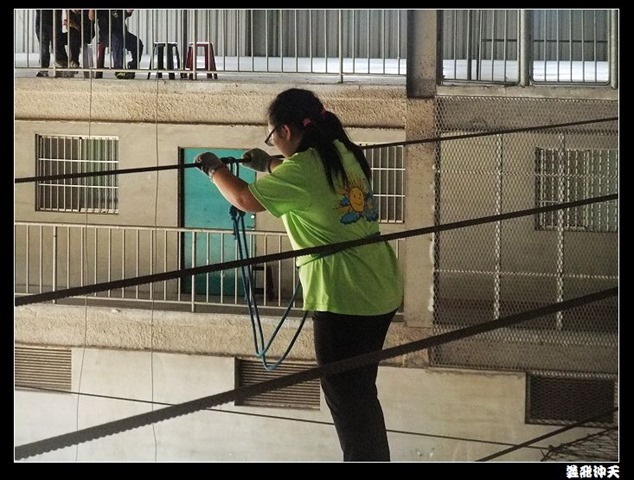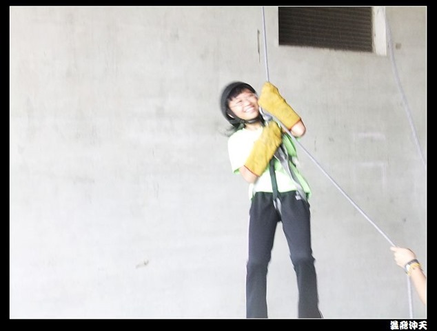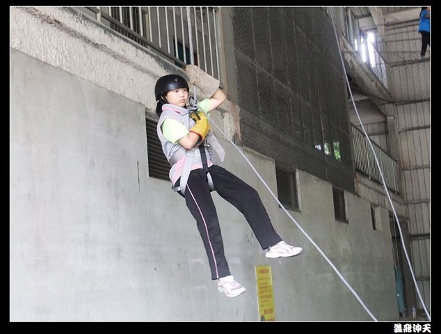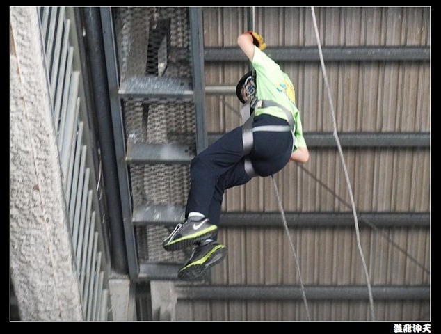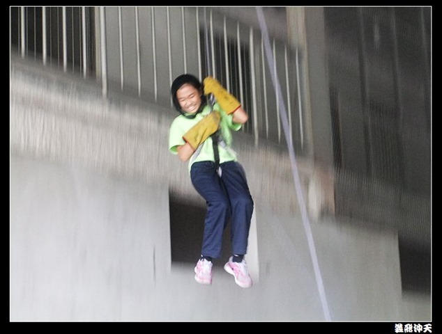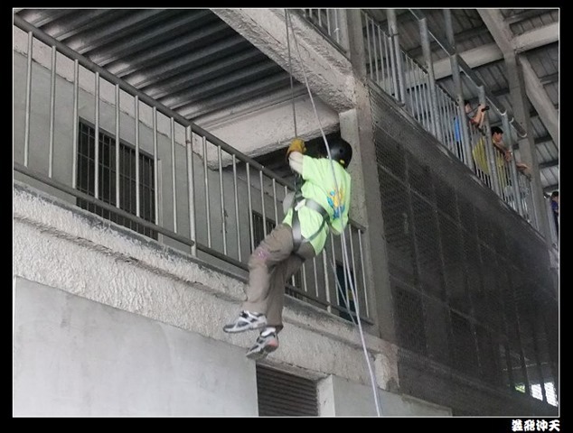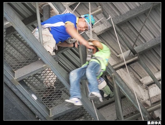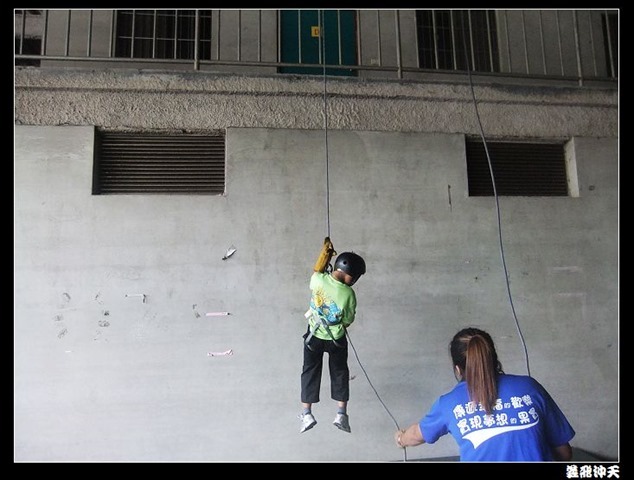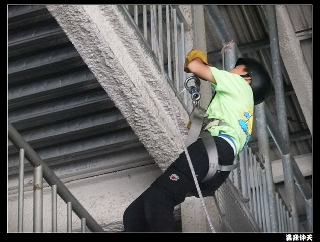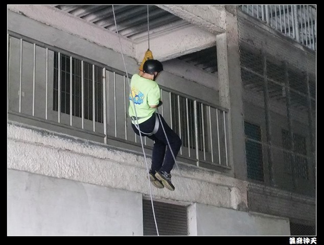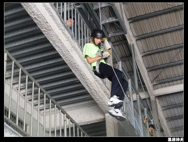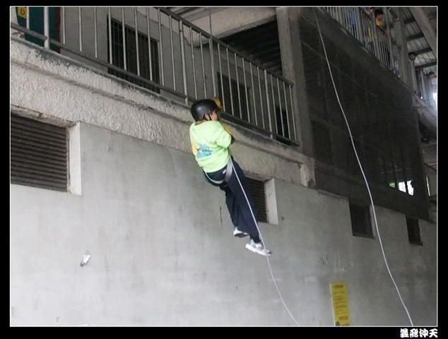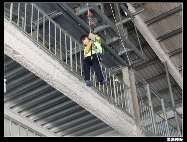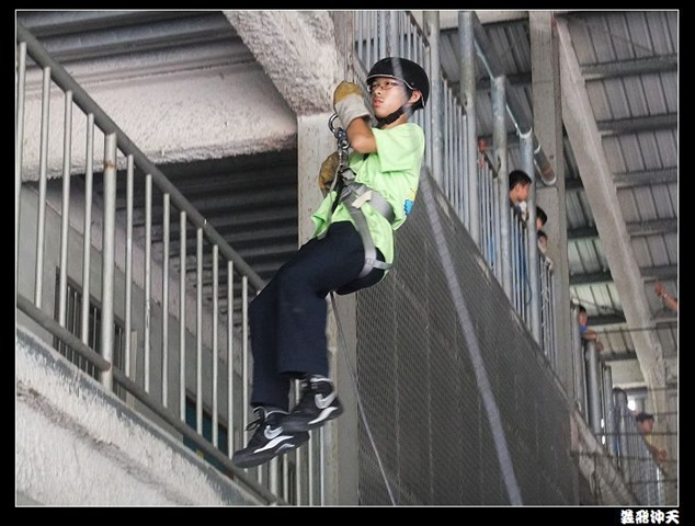 垂降高度達三層樓,這三層樓的高度說高不高,但卻是人類對"高"之恐懼的臨界點,好多人在半推半就之下,終於克服對高的恐懼,兩眼開開準備投胎了(OH……誤,是準備垂降囉)!