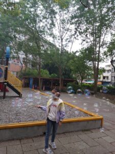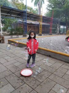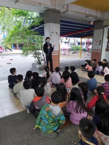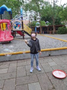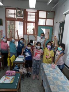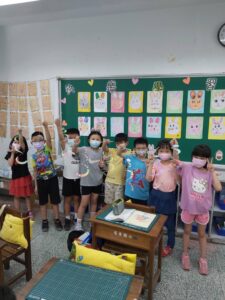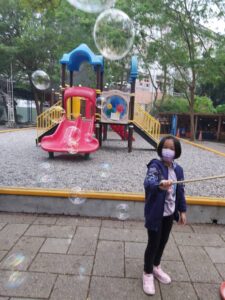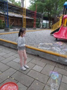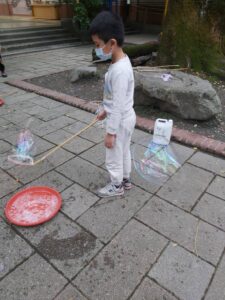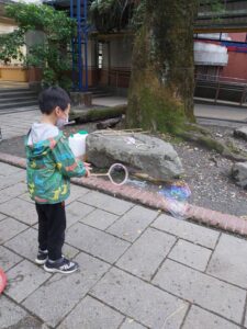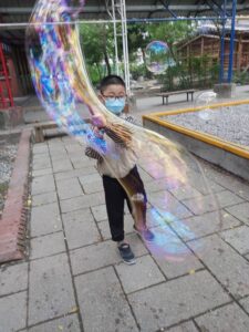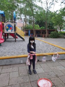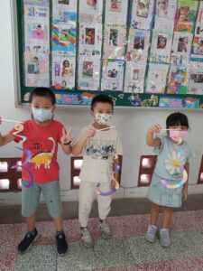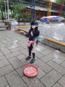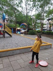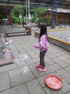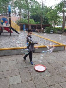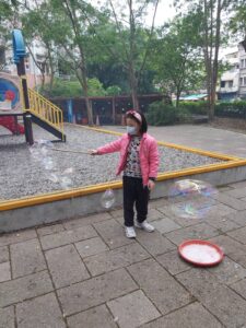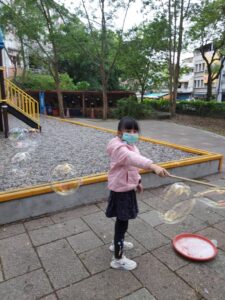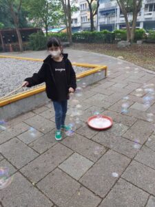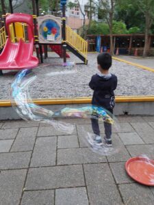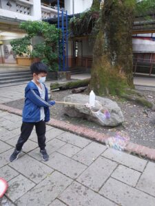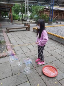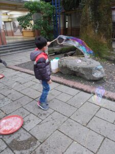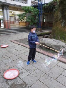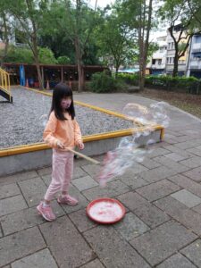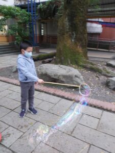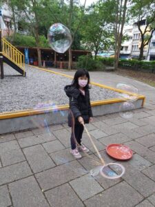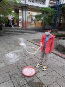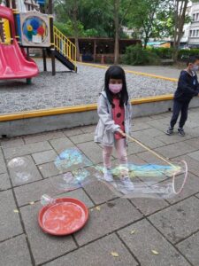 孩子們開心的看著揮舞著各式造型的泡泡棒。看著大大小小的彩虹泡泡,孩子們的嘴角揚起了燦爛的笑容~?