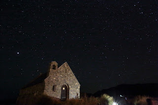 夜晚的重頭戲來了!全世界排名第一的觀星點,tekapo,吃完出去,就看的到天上的星星,好多!好美!!可惜去牧羊人教堂時,遇到一堆不懂關車燈的大陸人,一直開車大燈照,都快氣死了,我在用B快門拍星星耶!果真要半夜1點來拍才是對的時間!唉!