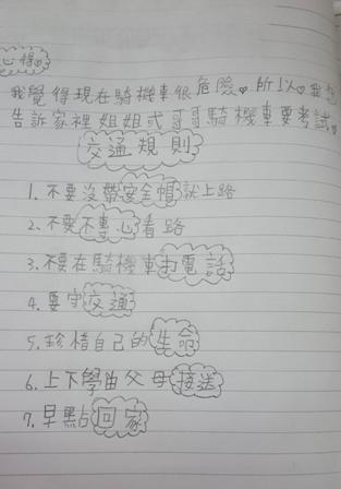 利用10月3日班級內有同學未成年騎車,加強宣導交通安全規則。透過報紙真實案件,學生發現交通安全事故天天都在發生,意外無法避免。「規則」是為了使大家更安全,而非約束大家使大家不方便。造成無法彌補的傷害時,再多的悔恨也換不回珍貴的生命。期許學生能體認交通安全的重要,並轉知家長減低未戴安全帽及未成年騎車的機率。