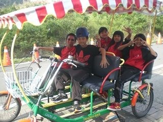 我們先在一個涼亭吃午飯,吃完後,我們班就跟老師一起去騎腳踏車,我們還跟老師尬車,我覺得很好玩,我們還騎了3圈半呢!那時我們班玩得很開心,但我們本來要去坐船,但是沒時間嚕!所以我們就拍拍照就回家了。