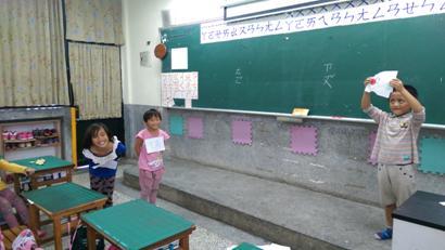 認識生活中最常看到的交通安全號誌「紅綠燈」,讓孩子在生活中出門時養成遵守交通規則。雖然村子裡沒有紅綠燈,但是學生也能從情境演練的過程中,理解到「馬路如虎口」的意思,更是要在沒有紅綠燈的道路上注意,注意「行」的安全。