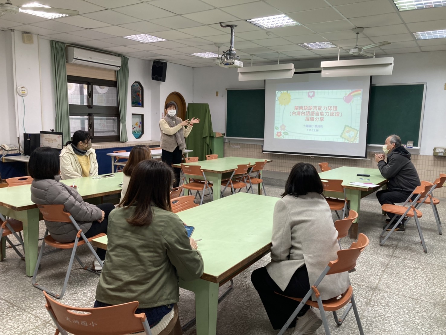 邀請友校大隱國小本土語教師葉銘珠老師到校擔任講座 分享參加臺灣台語認證的經驗和現場教學心得 鼓勵現場老師踴躍參加本土語認證 投身本土語教學的行列