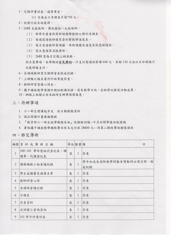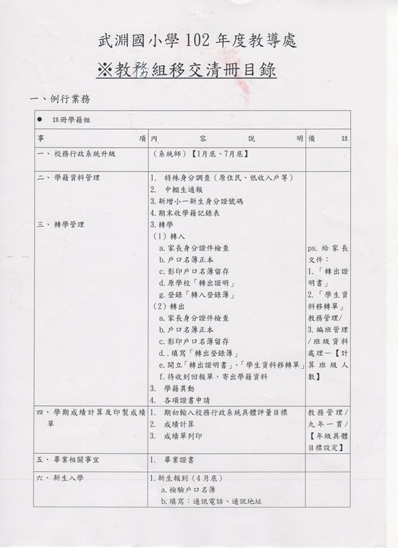 武淵國小102學年度教導處教務組業務移交清冊Post author:汪耀文Post published:2013 年 8 月 23 日Post category:未分類相關內容綠博校外教學剪影99.03.302010 年 4 月 1 日104學年度-105學年度特教業務移交清冊2016 年 8 月 1 日103年9月14日全校班親會2014 年 11 月 11 日