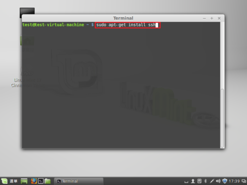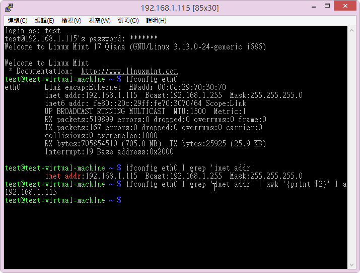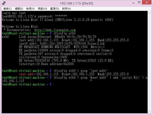 發佈於 2014 年 8 月 28 日2021 年 3 月 18 日 作者: t850008在 Linux Mint 17 Qiana x86 安裝 ssh 服務為了可以遠端管理操作 Linux,所以即使是使用 Linux 的桌面版本,我仍然會安裝 ssh 服務,方便從習慣熟悉的 Windows 來進行管理。[@more@]安裝 ssh 服務$ sudo apt-get install ssh查看 IP 位址$ ifconfig eth0 | grep ‘inet addr’ | awk ‘{print $2}’ | awk -F’:’ ‘{print $2}’192.168.1.115這時候就可以在 Windows 上利用 pietty 之類的連線軟體進行遠端管理