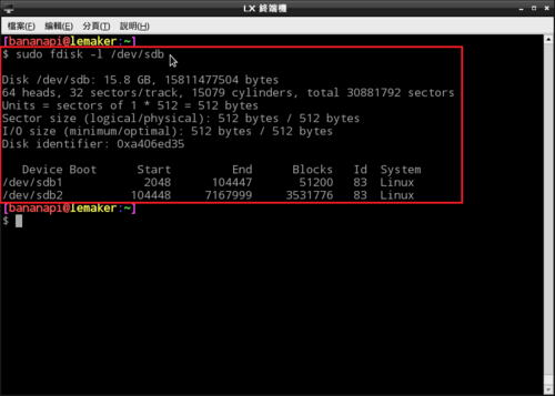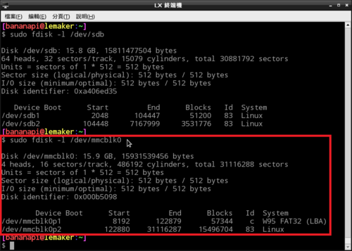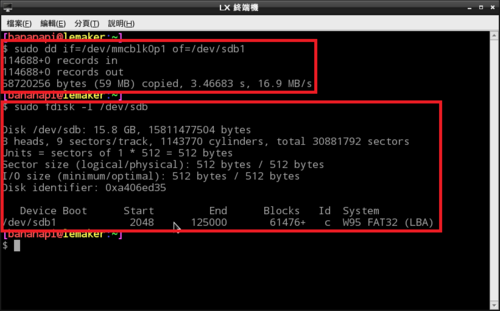 將原本的 /dev/mmcblk0p1 使用 dd 指令複製到 /dev/sdb1