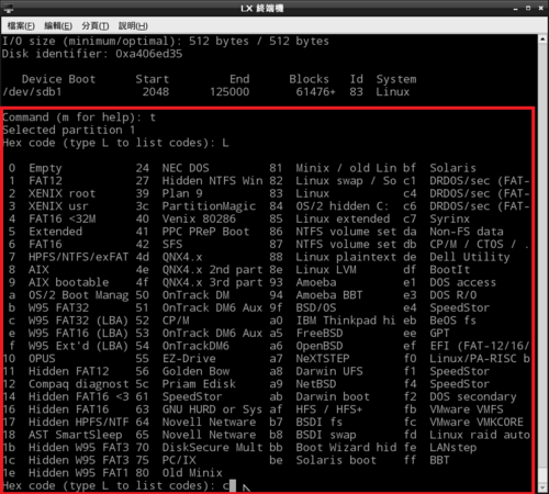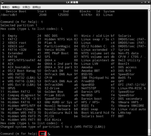 更改分割區的型別,將第一個分割區型別改成 c W95 FAT32 (LBA)