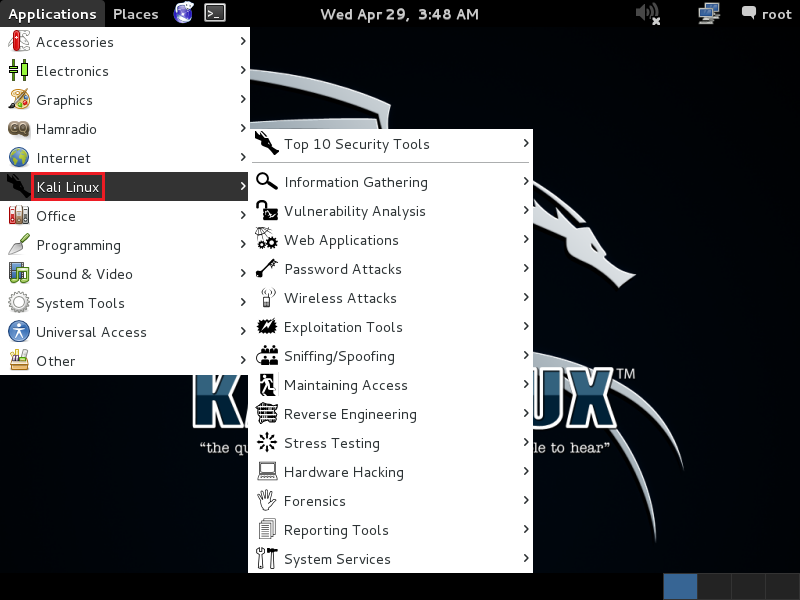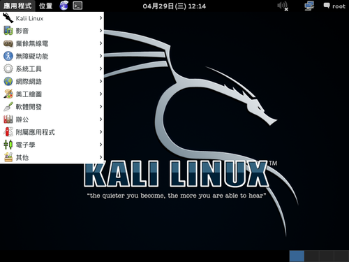 Kali Linux 是一套可以用來做為滲透測試的工具,之前的名稱就是 Back Track,這個版本是基於 Debian,裡面包含近 500 套的程式。