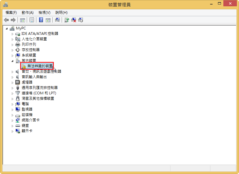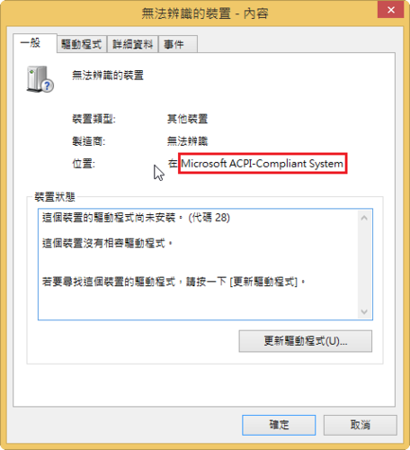 因為硬碟故障,所以重新安裝 Windows 8.1 系統,安裝完成之後,該安裝的驅動也都安裝之後,在系統裝置管理員中還是出現了一個「無法辦識的裝置」。