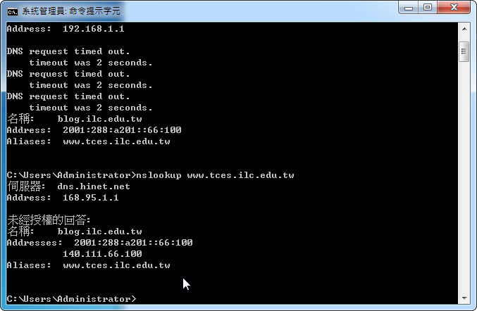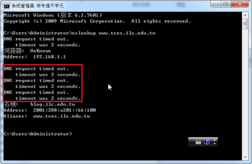 [@more@]使用 nslookup 指令查詢了一下子,發現查詢 Domain Name 時有 timeout