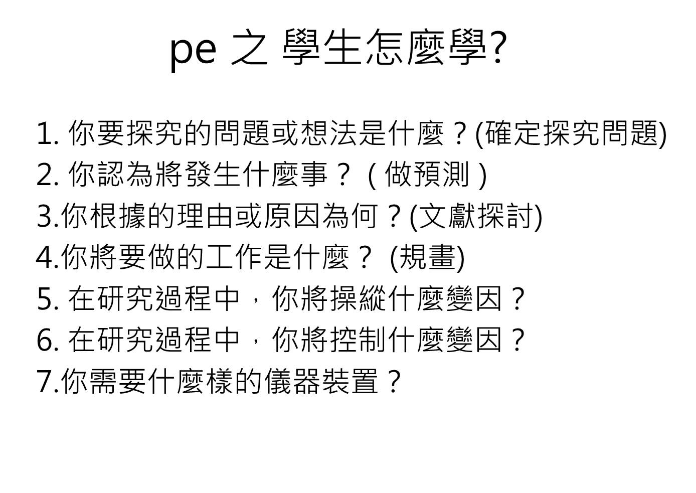 這學期宜蘭自然與生活科技領域的共備主要的發展方向是:配合新課綱「探究與實作」的理想,研發課本教材的探究化,也就是帶領學生以探究的方式學習課本內容。而這次的公開課我們設定的目標是:演示(沒錯…輔導員的公開課其實是一種教學演示)如何帶領學生進行「pe計劃與執行」,所以當兩位擔任公開課的老師把教案給我(我也是共備成員)的時候,我檢視的第一個重點是:老師如何帶領學生辨明多個自變項、應變項…,學生是否…能規劃具有可信度(如多次測量等)的探究活動(PE-IV-1)。我希望呈現的不是學生照著老師或課本設計好的步驟進行實驗和紀錄,而是各種自變項、設計實驗都能在老師指導下由學生自己提出。不過pe「計劃與執行」的前提是觀察時有做到「定題」,有了「問題」才有後續的「問題解決」阿!所以我以下的7點學生應有的表現來檢視教學活動的設計
