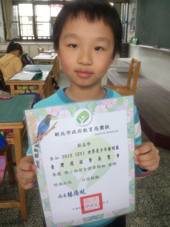 本班蔡孟學同學,參加2013IEYI世界青少年發明展台灣選拔暨展覽會,榮獲國小安全健康類組金牌.恭喜!!