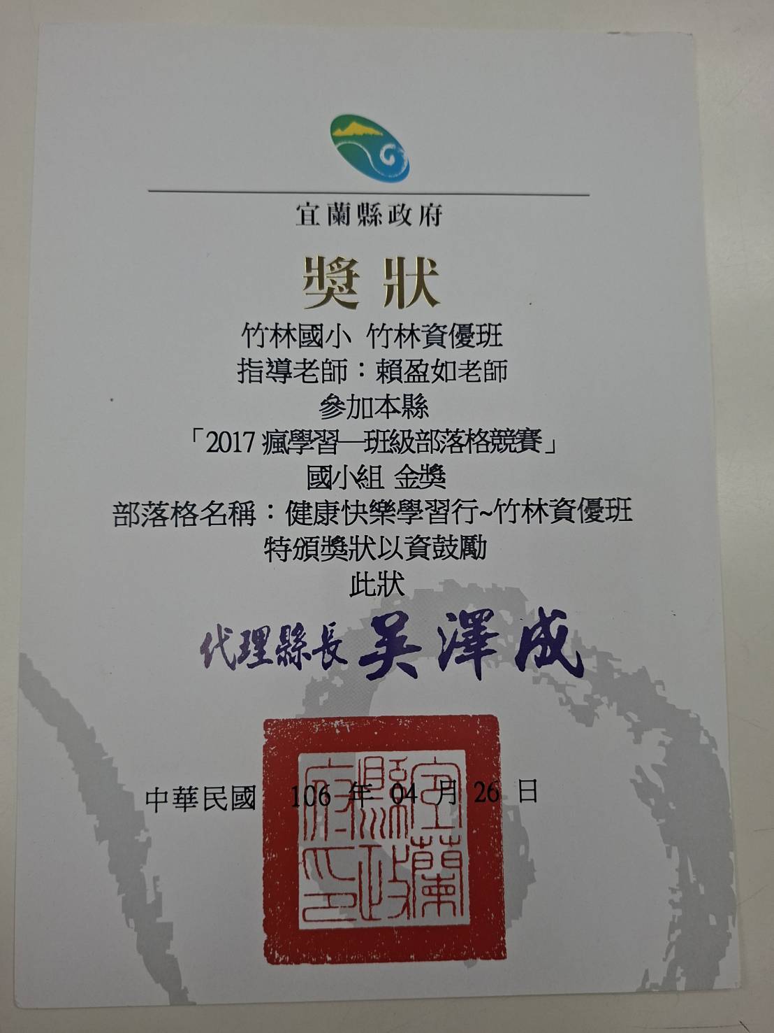 狂賀!榮獲宜蘭縣2017班級部落格競賽-國小組金獎
