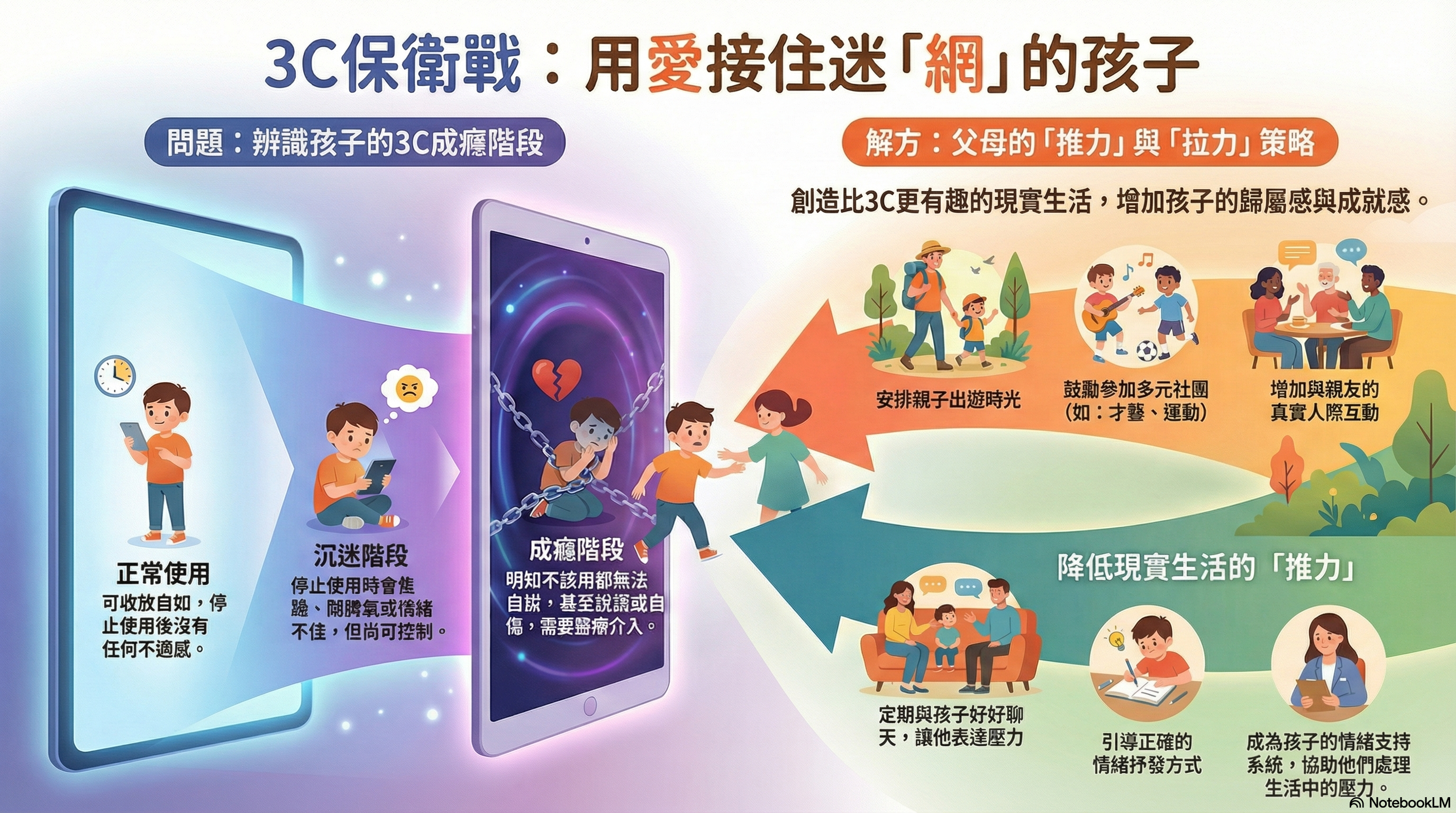 家長應思考孩子使用 3C 滿足了什麼需求(如心理慰藉、聲光刺激、多巴胺)。要預防成迷,需從現實生活的推拉力著手: