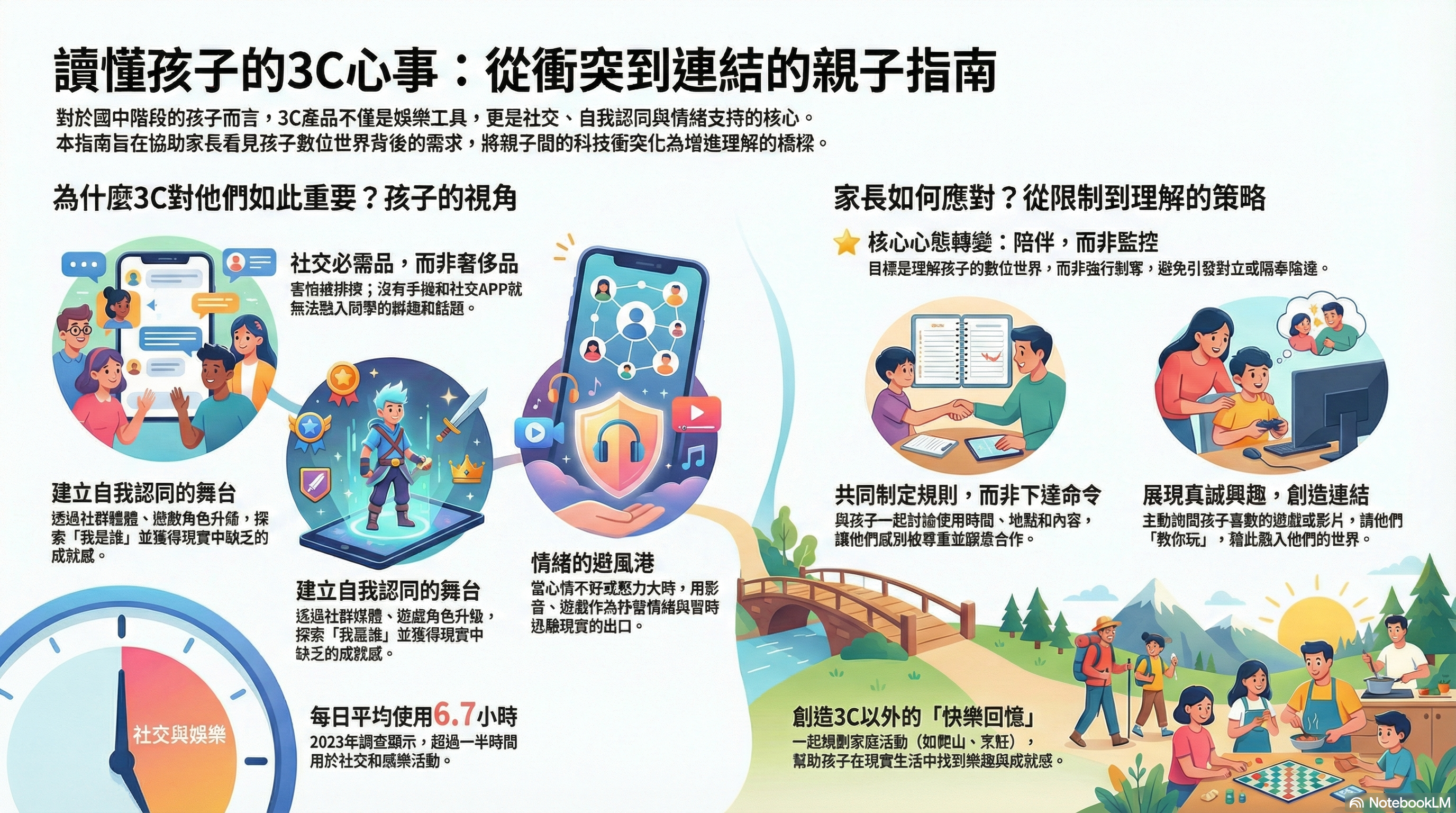 • 家長的角色:家長應作為「鏡子」反映孩子情緒,並以身作則健康使用 3C,創造共同的快樂回憶。