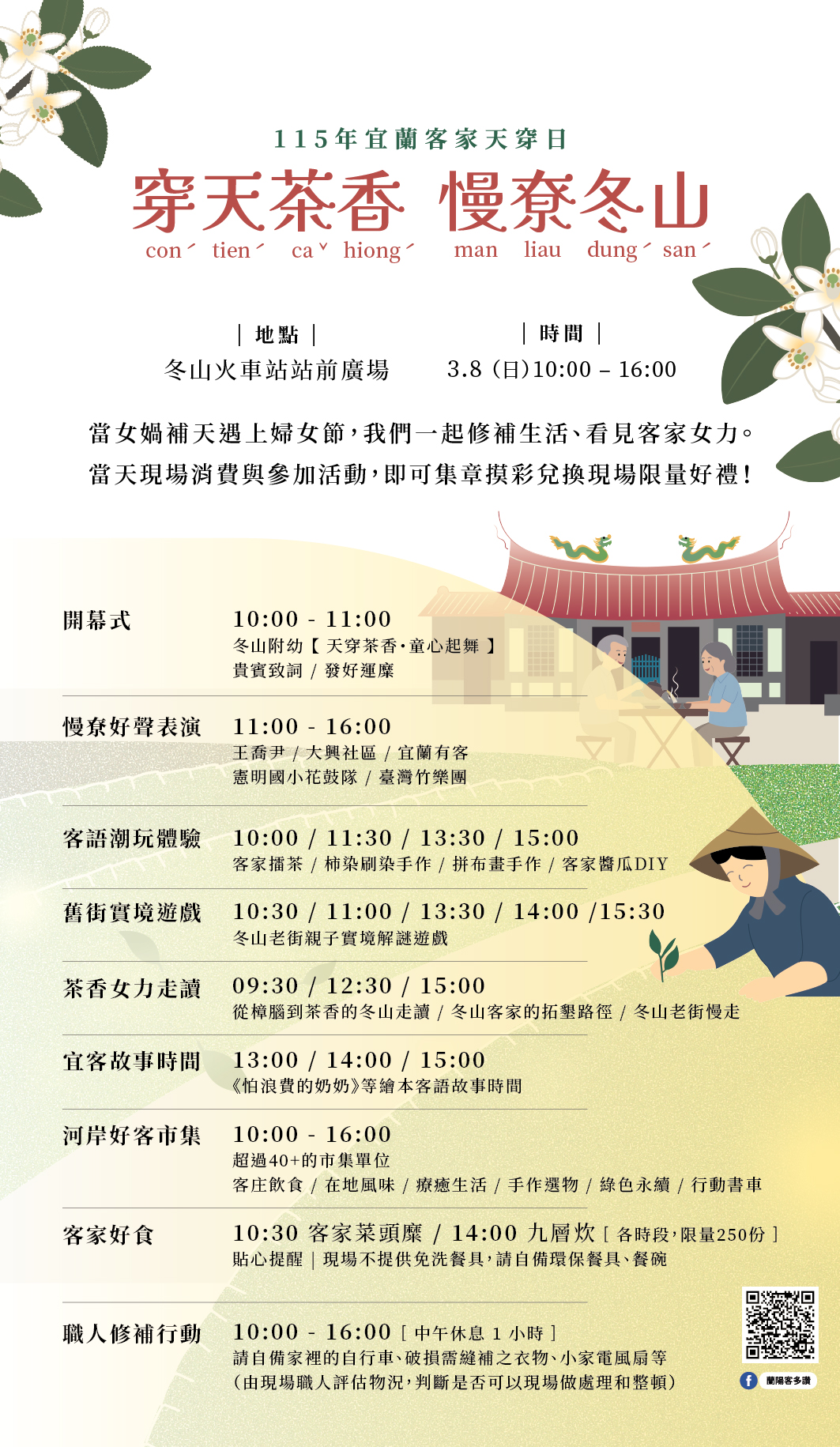 一、旨揭活動訂於115年3月8日(星期日)於冬山火車站站前廣場及鐵路橋下空間盛大舉行,以「穿天茶香.慢尞冬山」為主題,規劃有客家特色表演、河岸好客市集、走讀活動、實境遊戲、客話說故事、客家美食及手作體驗等豐富內容,活動將客家傳統節慶結合在地觀光特色,兼具文化傳承與環境保護教育之意義。