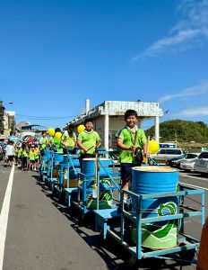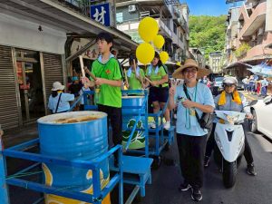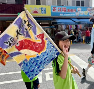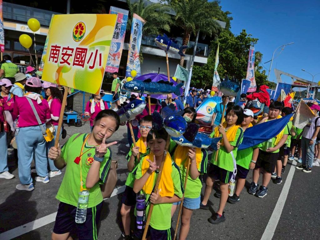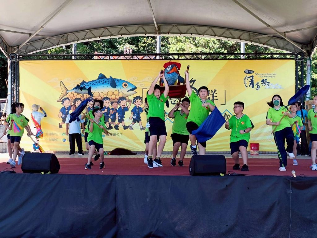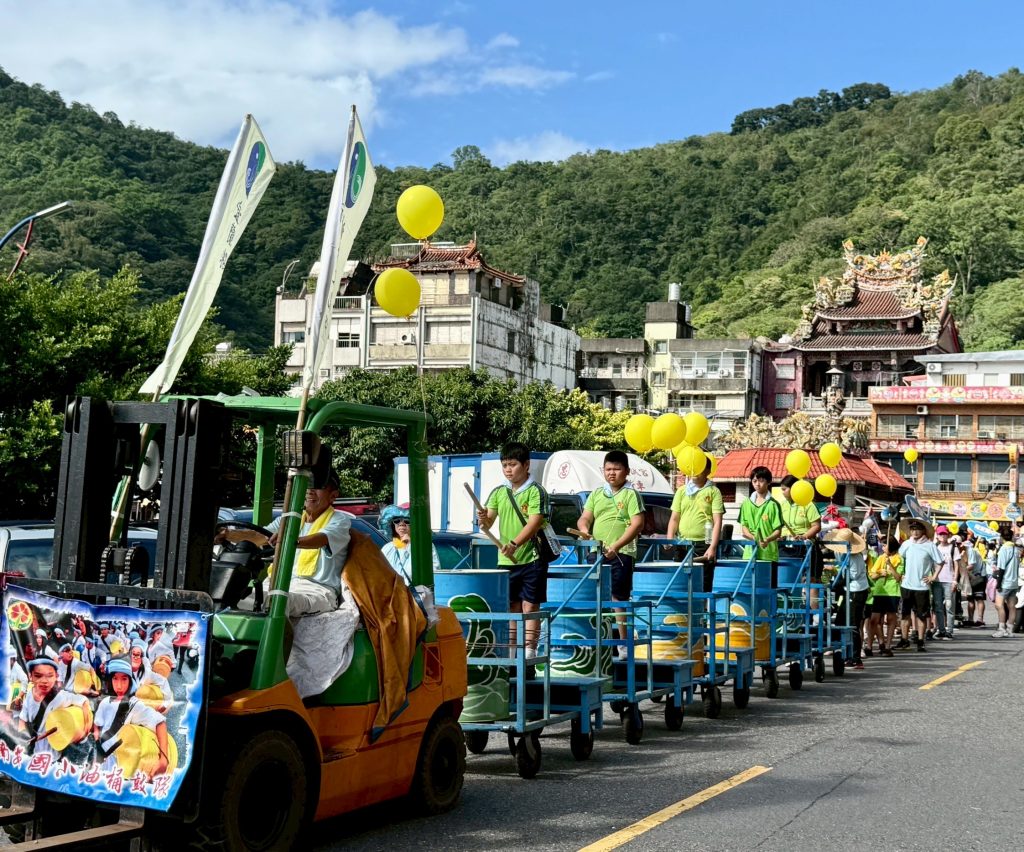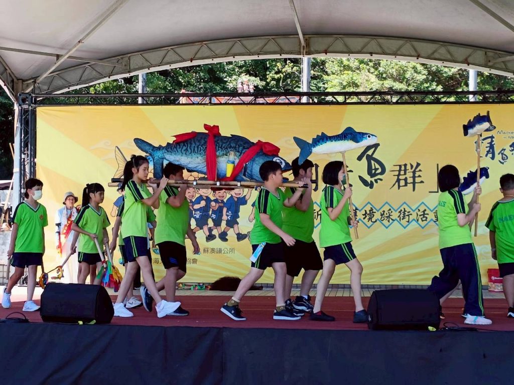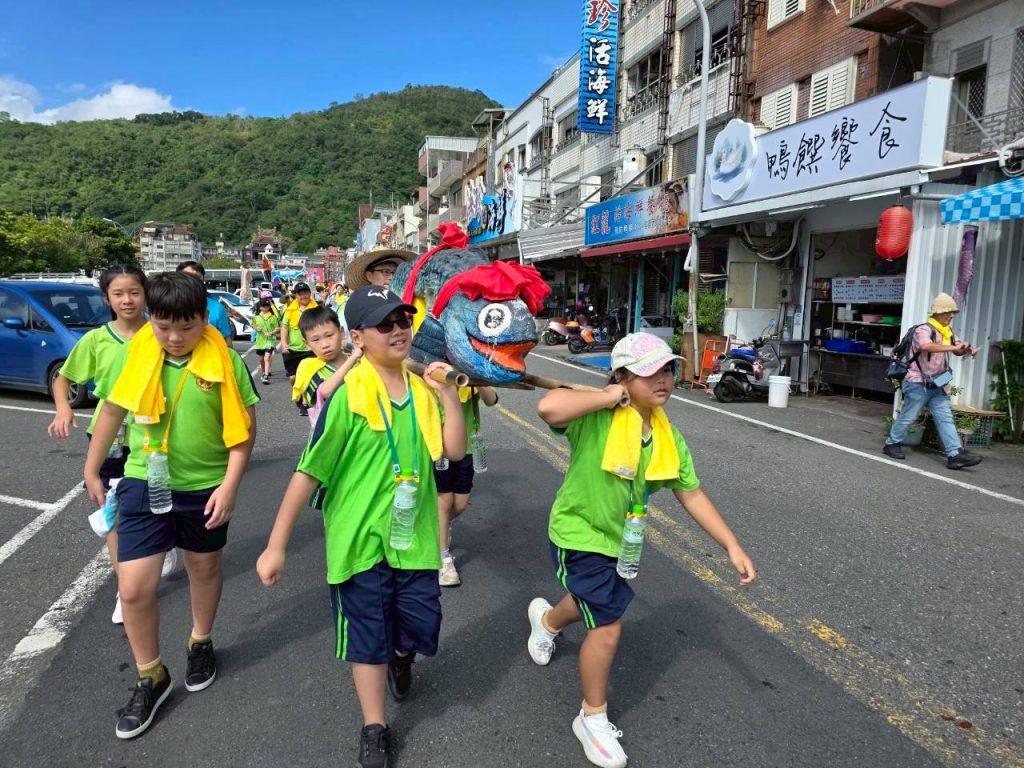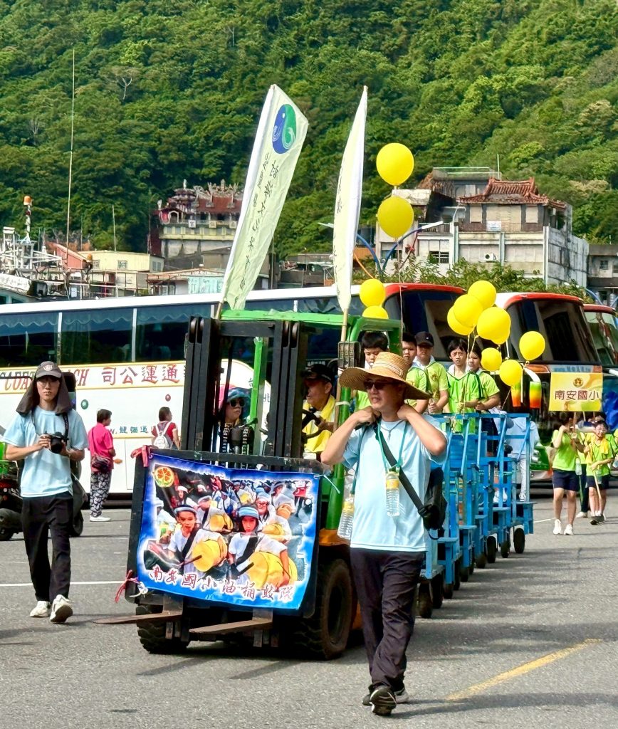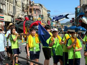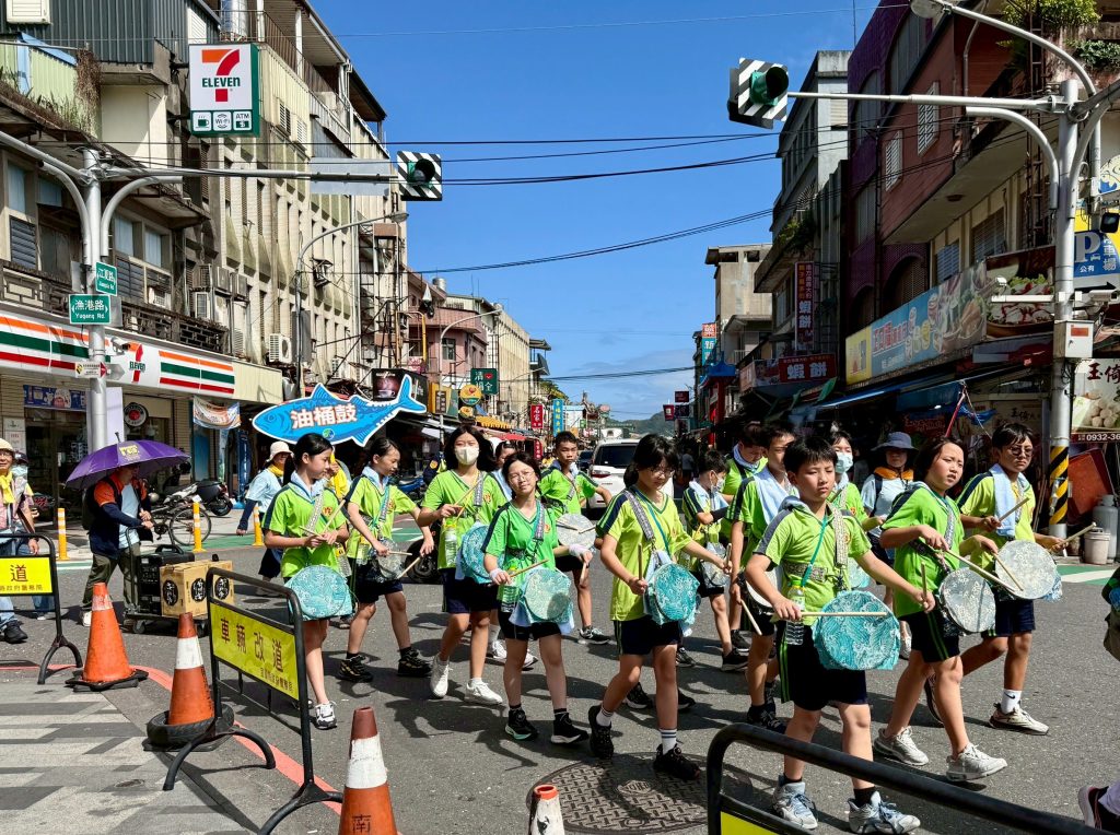 六年級油桶鼓陣,五年級小鯖魚陣,四年級的小漁旗陣踩街共襄盛舉