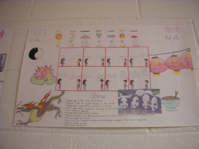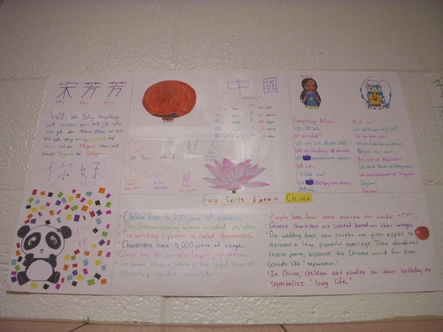 這所學校二~六年級外語課程以西班牙語為主,七~八年級的外語課程有西班牙文和中文,中文教室外貼滿學生的作品。