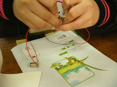導電物品1:訂書針…注意卡紙上的訂書針…形成通路..燈泡亮了