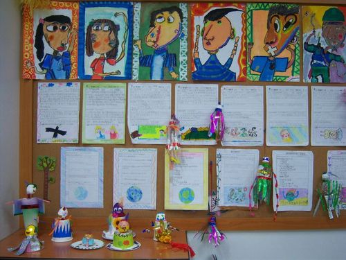 教室布告欄及桌上放置學生的成果與作品分享