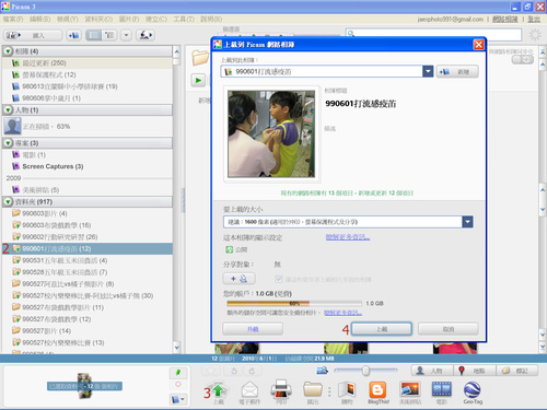 上面所提的三項工作步驟需要的是用心,但不致於多麻煩,比較令人頭痛的工作,通常會發生在照片上傳這一步,因為,就許多人以前的經驗而言,上傳照片是件很費時的工作。以前,確實如此,所以,以小弟有限的能力及有限的時間,是無力負擔這樣的工作,但,在使用Picasa網路相簿及Picasa照片管理軟體後,上傳照片是可以以資料夾為單位一次處理的,所以,在我將相機裡的照片資料夾複製並重新命名到電腦之後,我只要點四下就可以把這整個資料夾裡的照片上傳到Picasa網路相簿上。這四個動作分別是”1.開啟Picasa照片管理程式”→”2.點選要上傳的資料夾”→”3.點擊「上傳」按鈕”→”4.在上傳視窗中點「上傳」”,做完這四個動作,即完成上傳指令的下達,不管資料夾裡的照片有多少(更正,同一個相簿裡不能放超過1000張照片。),而且可以接著再做上傳的動作,反正電腦會自己按先後順序排隊,丟下讓電腦自己慢慢上傳,我們可以去忙其他的事。