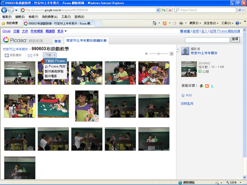 曾有四年級級任導師詢問是否有軟體可以幫忙製作播放光碟,因她帶的班級上五年級後會重新編班並換老師,她想把中年級階段為他們拍的照片整理後燒給學生留念。聽了這樣的要求後我想了想,我自己從以前到現在已收到很多照片光碟片,這些光碟片現在到哪裡去了?我會特地再把這些光碟片拿出來回味嗎?所以我給她一個建議,把這些照片放到Picasa網路相簿上吧,把這個相簿的投影播放連結以E-mail方式寄給學生,學生就可以直接點連結看投影播放模式的照片,這種方式不浪費資源,而且在網路上隨時可以看到,不也和老師原本分享照片給學生留念的初衷相符嗎!