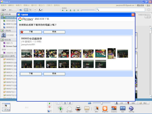 喜歡這個相簿裡的照片嗎?點”下載”裡的”下載到Picasa”,一次全部下載回去。出現下圖時,按一下”下載”,電腦就開始幫你下載該相簿的所有照片。