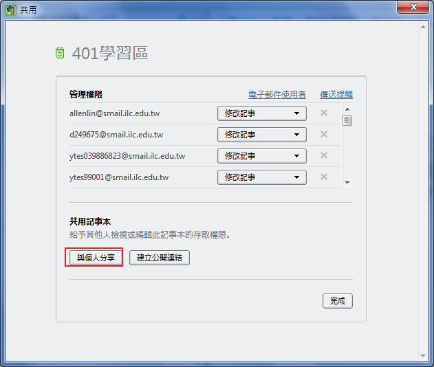 4.然後依序輸入學生們的電子郵件帳號,選擇給予他們共同編輯的權限