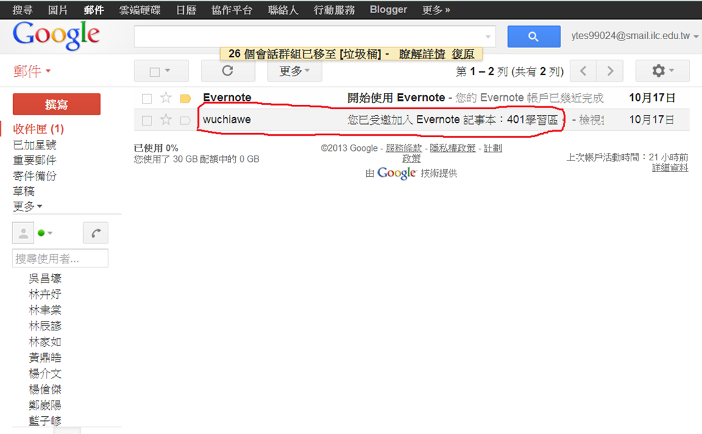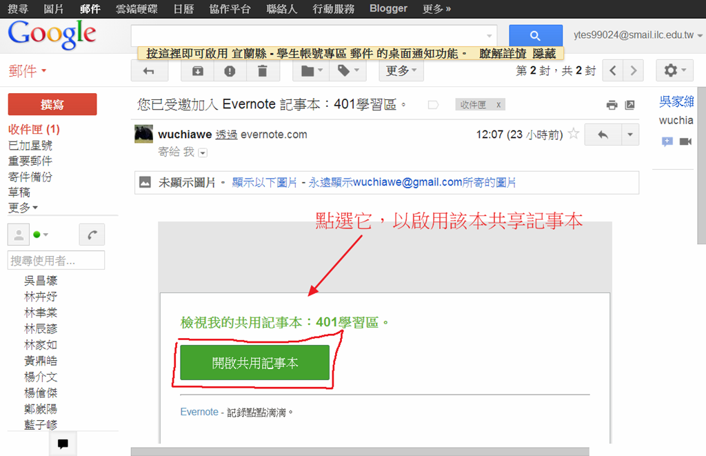 5.然後學生到自己的電子郵件中收取老師寄給他的邀請共用信函,並點選之,這樣一來,共用筆記本(401學習區)就能啟用了
