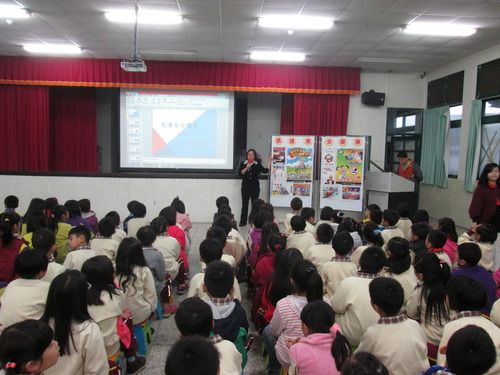 為了加強學童交通安全的知識,蔡老師利用全校集會實間進行交通安全教育–行的安全宣導,內容包含1.校園篇:不在走廊、樓梯等處奔跑或嬉戲2.上下學步行: 靠邊走,不橫隊併排,不跑不跳,慢慢走。3.騎乘單車:要戴安全帽並隨時做好腳踏車的安全檢查,以隨時都可以停止的速度(與前車距離約3公尺)行駛4.搭乘車輛:排隊上下車、前後座皆要繫好安全帶、兒童應使用安全座椅等,主要讓孩子知道,安全是回家唯一的路。