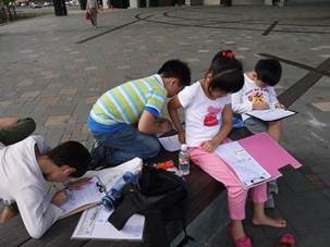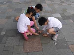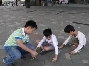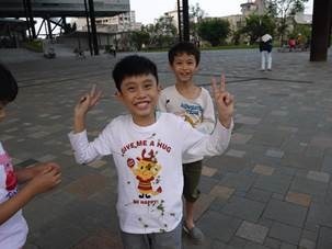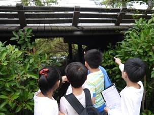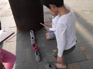 接著,來到戶外,很快地就在運動場橋下找到心心的任務「2張蜘蛛網」,而宥宥的「5片葉子」任務,大家也能蒐集不同的五片落葉。最後,我們來到文化工場,老師請大家完成最後一個任務,丈量兩根大柱子的距離。大家先拿鞋子、鉛筆盒來丈量。後來,宥宥想到用大跨步的步伐來量,宇昕、磊磊、心心用長一公尺的草來量,很神奇的是兩種方法量出來的數據非常接近喔!