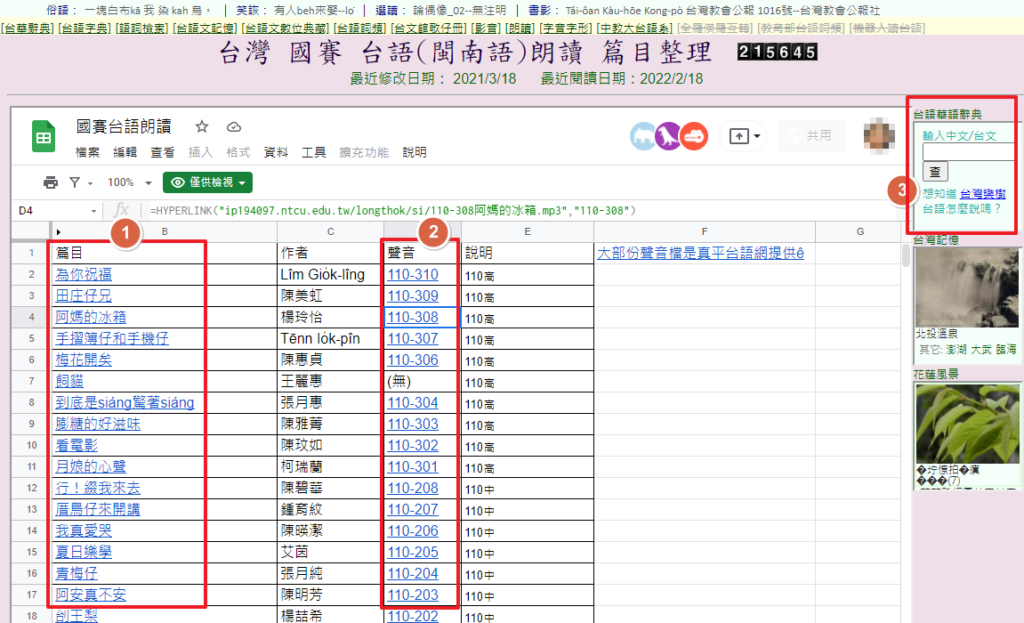 這个網站收集99年到110年的文章,算誠豐沛,有時間提出來罔看罔看應該是袂䆀,用聽的嘛是會感動。