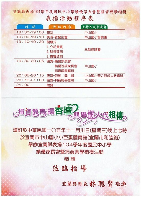 1051130宜蘭縣104學年度績優家長會暨捐資興學楷模表揚作者:cmg2016 年 11 月 30 日2021 年 3 月 18 日竹林家長會這幾年愈來愈旺,感謝家長會長的帶領,在所有家長會成員的努力下,我們在榮獲宜蘭縣104學年度績優家長會優等的殊榮!另外,也要特別一提:本校林淑芬副會長在103、104學年度,對學校師生活動及各項事務運作盡心盡力、積極參與,捐資超過10萬元,縣府也特頒獎牌,感謝她為學校付出的心力。 成功在於享受努力的過程~感謝家長會支持學校、支持教育~我們繼續加油!