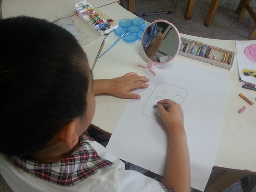 小駿畫自己作者:陳堉樞2013 年 9 月 10 日2021 年 3 月 18 日自閉症的小朋友對於畫臉,總是有些困難,今天太陽老師教小駿用鏡子觀察自己的臉,看看鏡中的自己,仔細瞧瞧自己的眼睛、鼻子、嘴巴,再畫到畫紙上。