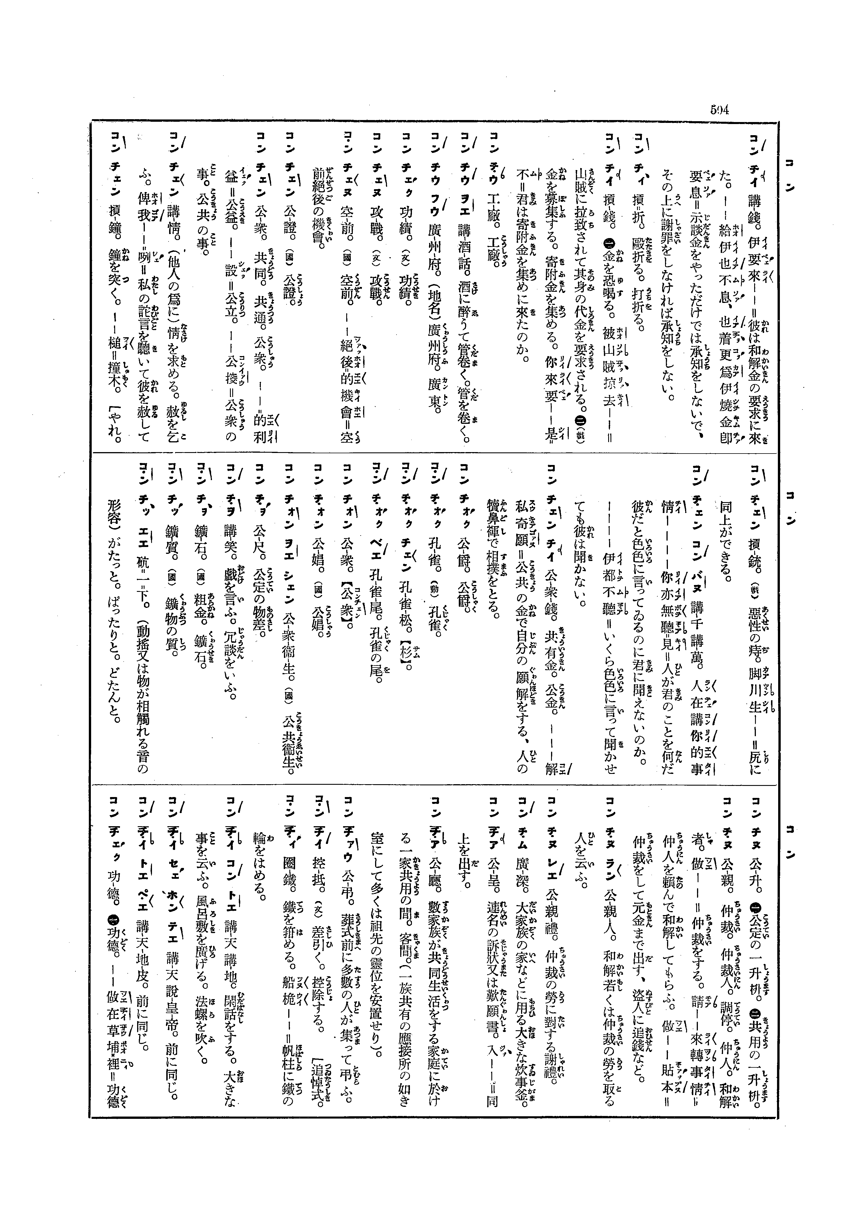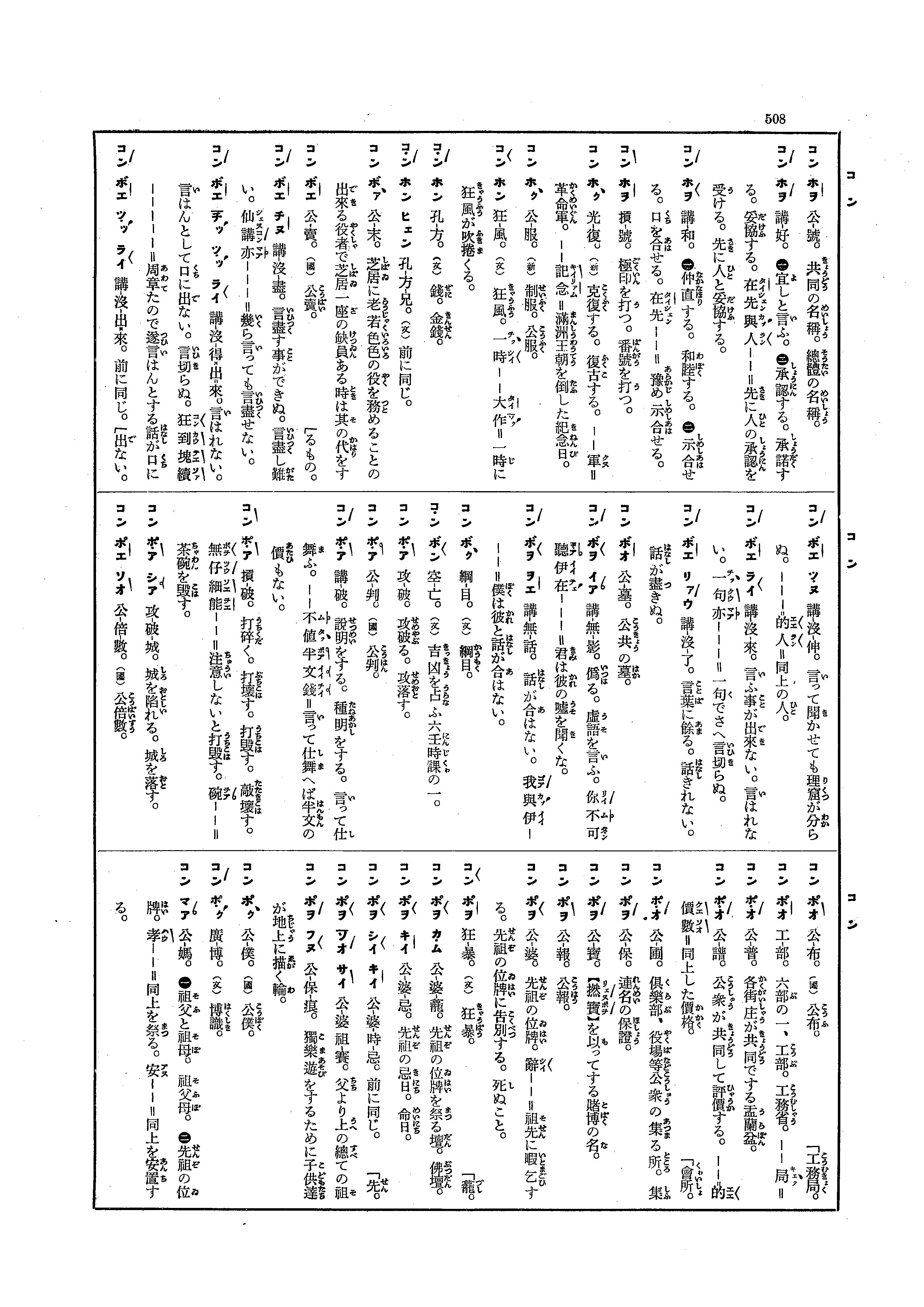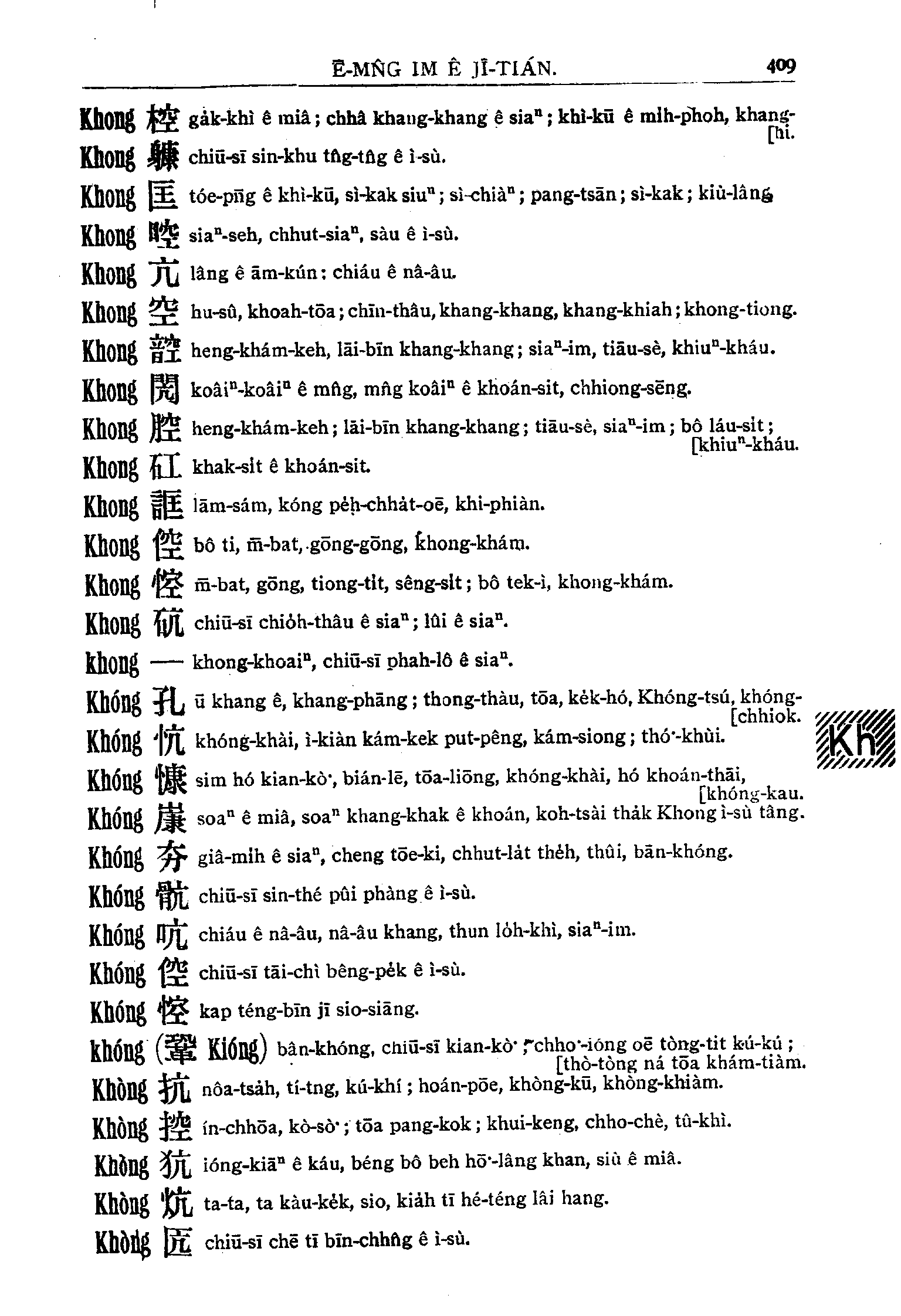 12546Khong  空hu-sû, khoah-tōa; chīn-thâu, khang-khang, khang-khiah; khong-tiong.虛詞, 闊大; 盡頭, 空空, 空隙; 空中.原冊掃描