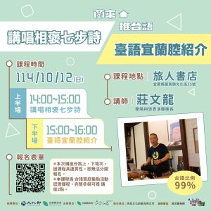 十月份的台語講座,我們邀請到蘭陽相褒表演團團長-莊文龍老師,要帶大家欣賞「相褒歌」的趣味與美感,一同品味歌詞中的民間日常與故事、賞析臺語韻律之優美!