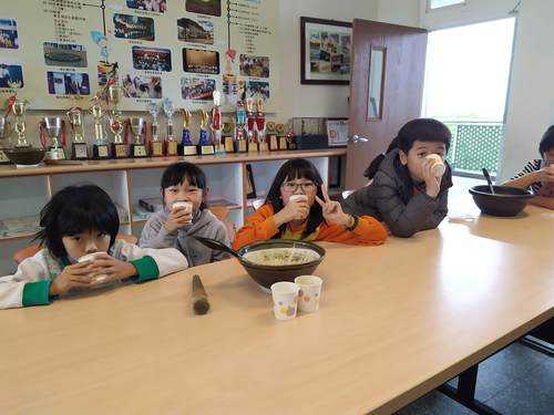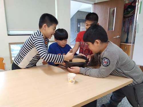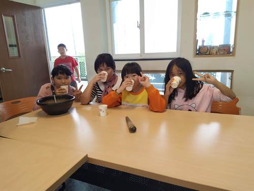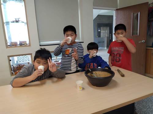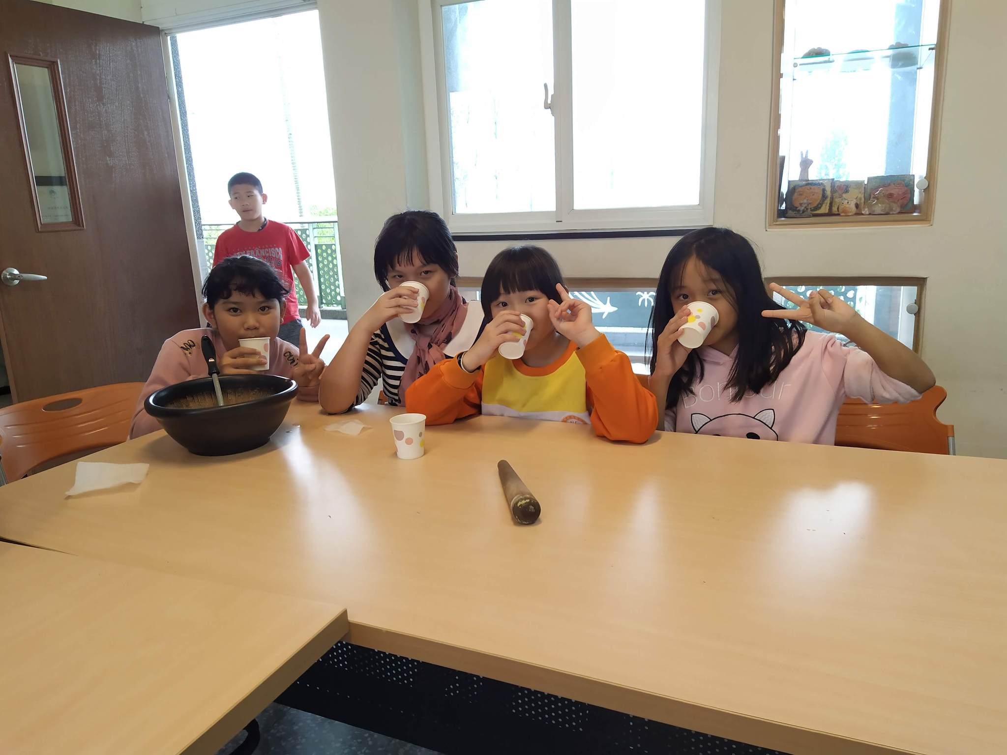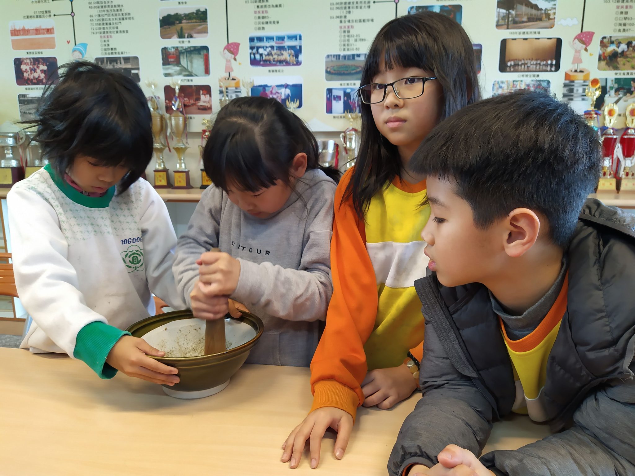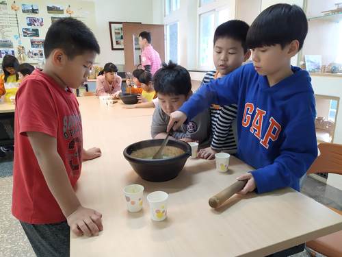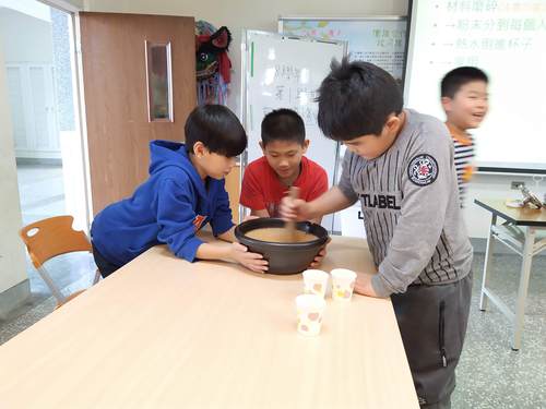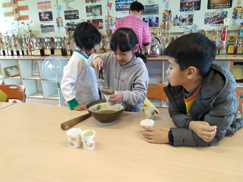 同學們都沒喝過客家擂茶,都好期待它的味道如何….加上熱水,快完成了,加油…