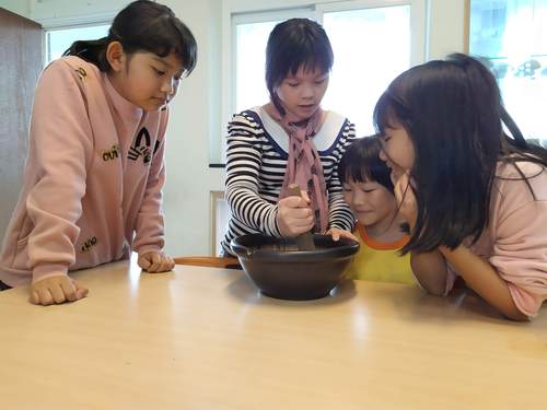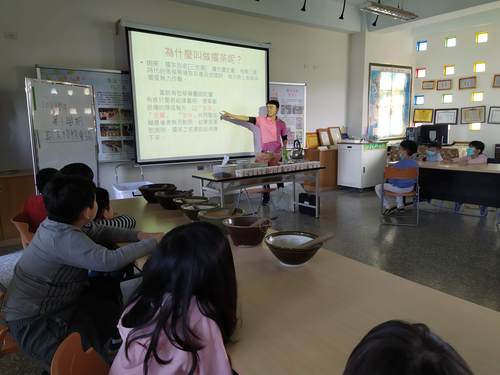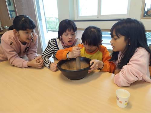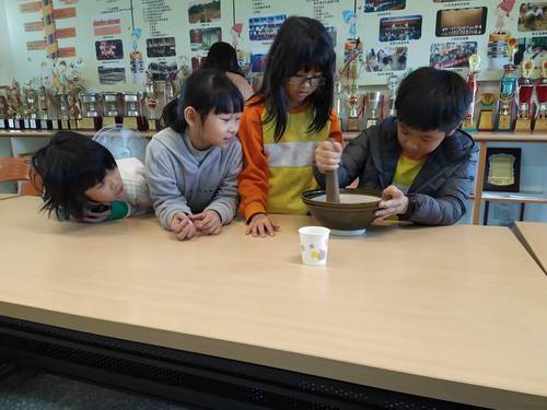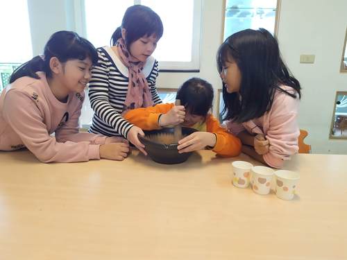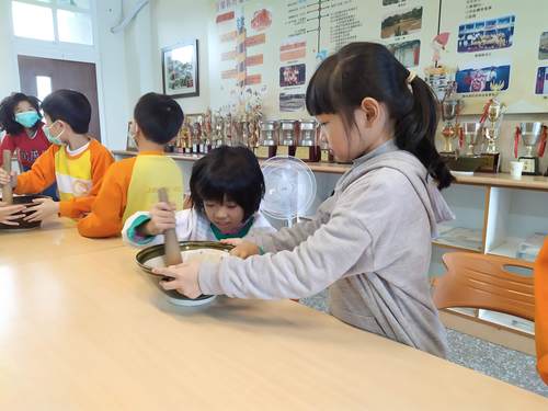 聽完南一叔叔介紹完擂茶的故事與介紹後,大家開始努力分工的磨呀磨…..