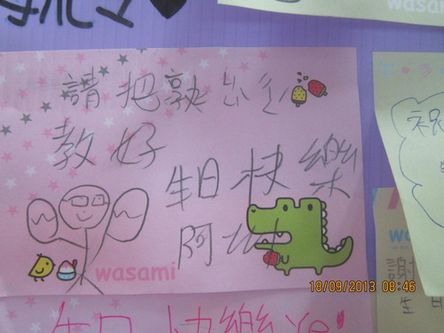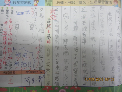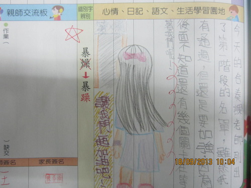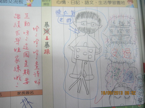 練習管樂心情分享-1由 王迺淳 · 2013 年 9 月 23 日 自從在聯絡簿短文寫作中新增了-「今天的合奏課」這個題目後,就可以了解孩子們現在的學習心情。孩子們:學習絕對不是快樂的,而是辛苦的,但辛苦背後的果實是那般的甜美,我們要一起共享哦! 連寫給同學的生日祝福卡也不忘提到管樂:小郭郭,加油!把你的後半拍練起來呀!今年的教師節禮物可以延後送嗎?希望全班都可以去參加縣賽啦!