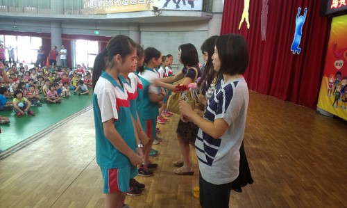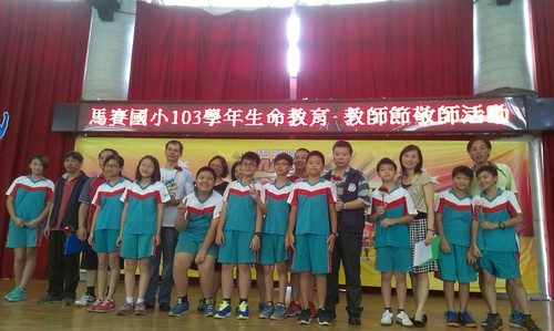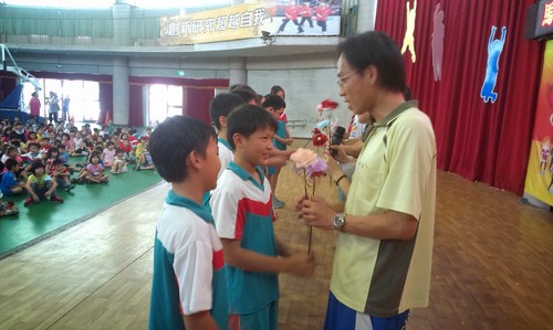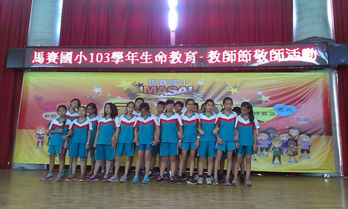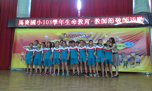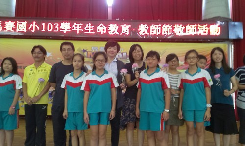 103全校教師節慶祝活動由 王迺淳 · 2014 年 10 月 8 日 今年的教師節的慶祝活動是進行大聲公的比賽,我們班上的代表當然非佩姍莫屬啦!在等待區的時候還有舒服的按摩可以享受哦!很幸運的班上的孩子可以代表全校獻花給老師們:和敬愛的老師們合影囉!最後以我們「美妙」的歌聲高唱一首:「感恩有你!」祝全天下的老師們永遠快樂!