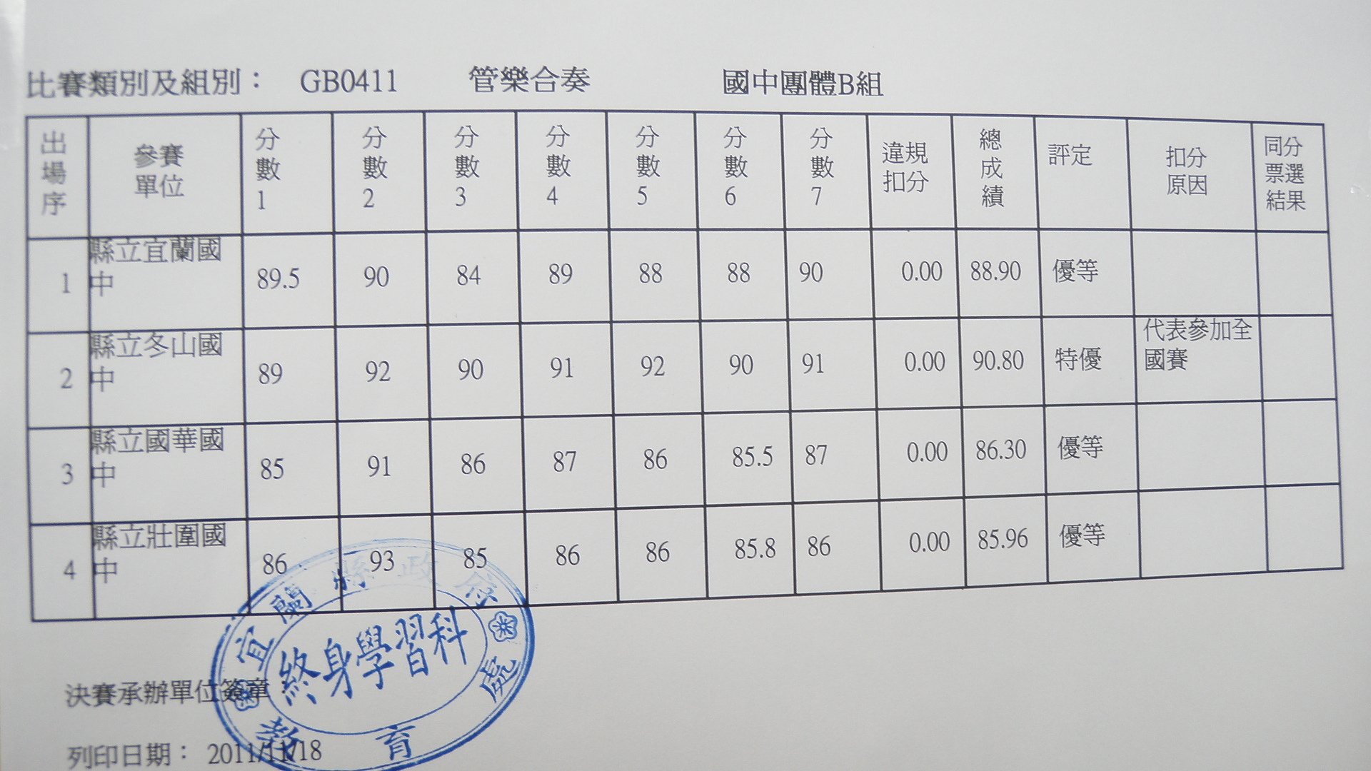 100年宜蘭縣音樂縣賽12 12 月 2011Lin Kunsheng這真是一個特別的比賽賽前一天宜蘭縣竟無特優的團隊令全團相當的緊張幸好同學們仍不負眾望順利完成特優六連霸真令老師們感到驕傲相信今年的全國賽一定也能奪得好成績的冬山國中加油~~~~ 比賽全紀錄