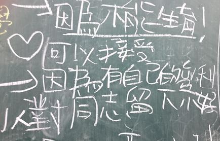 與學生分享愷他命已深入校園的現象,學生對於各式各樣的毒品呈現方式感到驚奇,如奶茶隨身包、軟糖等,也感到害怕。尤其是上網就可以購買的電子菸,亦暗藏危機。學生才說出之前學校有學生家人有購買電子菸,會請家人找合格檢驗的商家購買。另外警政署拍攝的微電影「勇敢的心」,也讓學生從另一個角度來看吸毒。吸毒的人常因好奇而誤入,造成最大傷害的則是週遭的家人。學生更提出如果有足夠的關心作為支持,也許吸毒上癮的人有機會借除。除了吸毒的人外,身旁的家人朋友都需要有一顆「勇敢的心」。
