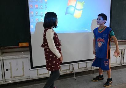 教師撥放影片「大企家的隨堂考」,請學生自己先選角色記住對話。