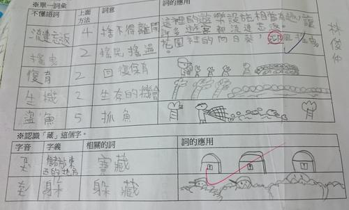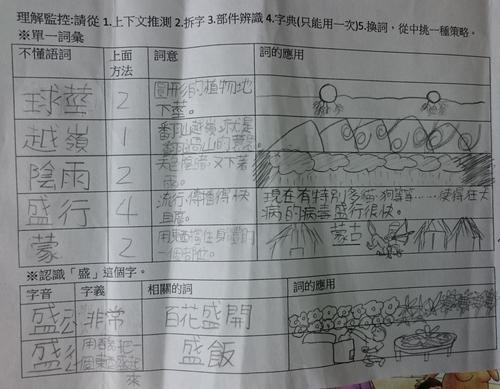 理解監控是教育部點點表中,每個階段都需要會的,我從孩子三年級開始共作,這學期開始我們就將它當成每課開頭的預習單,孩子經驗足夠,所以都可以按照老師給的東西一一解構,並完成他!但要孩子自己監控文本內容,要看懂文章內容,我會給予一些方法共有5種。(1.上下文推測2.拆字3.部件辨識4.字典只能用一次5.換詞。