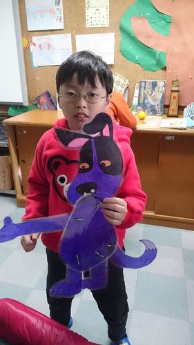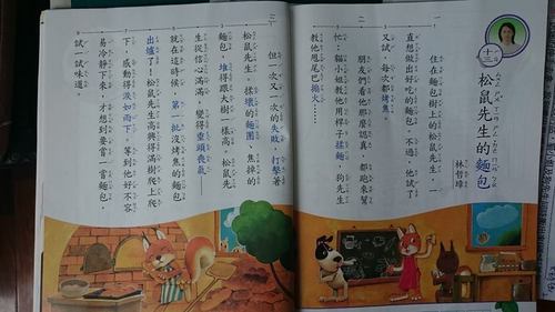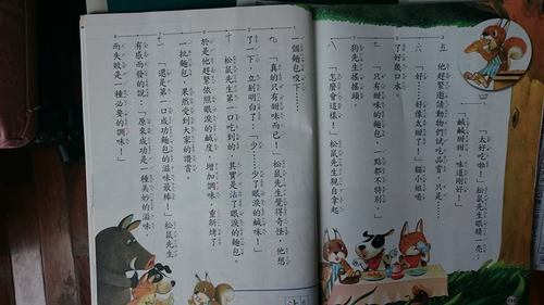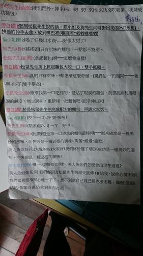 於是選擇故事體的松鼠先生的麵包進行劇本寫作,因該課的對話多,於是讓孩子們對照第13、14課文本差異處,並說明哪一課是完全劇本方式的寫作手法,清楚劇本需要的內涵(用對話的方式,括號中的是情緒與動作,要把整段話變成對話式的寫作方式)。於是分組著手進行改編劇本行動,原則是要將文章改編成對話式但要加上情緒及動作,方便演紙影戲。