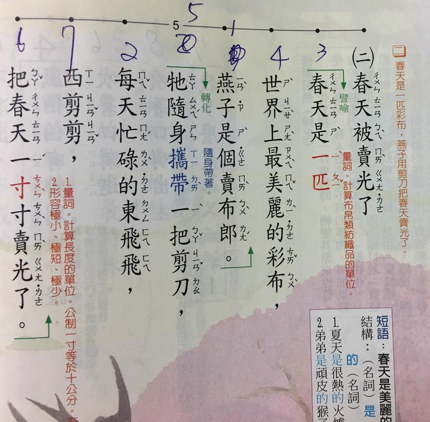 孩子「聽寫」過程中,必定會遇到不會寫的字。所以唸完詩的一個段落後,我便讓孩子舉手發問不會寫的字或不懂的語詞,一定要先發問,讓孩子猜猜看,想想看,最後再說明各個難字、語詞的用法與意義。