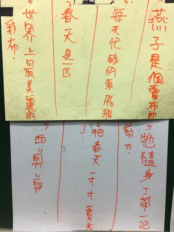 2. 老師唸詩句(一次一句、不照順序唸,老師自己先安排了一下等等念的句子),請全班拿出小白板,邊聽邊寫下老師唸的內容。
